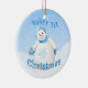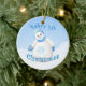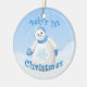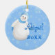 Menina de neve linda com floco de neve brilhante bonito na sua luva azul felpudo enquanto flocos de neve caem num adorno de saudação de Natal divertido para o primeiro Natal do bebê. Personalize com seu próprio texto na modelo fornecida. Você também pode desfrutar dos cartões de Natal e presentes com este design correspondente disponível na minha loja. Arte original e design por Anura Design Studio 2010.