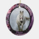 Este maravilhoso ornamento de dois lados fará o presente perfeito para qualquer um que seja dono de um cavalo ou outros animais de estimação. Uma foto do seu cavalo ou animal de estimação pode ser facilmente carregada na frente do ornamento junto com o nome dele. Na parte de trás está um doce sentimento com o nome do dono e também com o ano. Este ornamento fará a manutenção perfeita, monótona que será tesourada por anos vindouros.