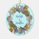 Nome da coroa e nome da data. Redondos, o Natal cerâmico mantém-se para um casal de adicionar os seus nomes à frente e ao ano atrás. O fundo azul claro mostra um círculo de conchas tropicais de praia como conchas, estrelas-do-mar, augers e naticas.