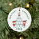 Este enfeite engraçado apresenta alguns elfos ocupados empilhando rolos de papel higiênico. Há um texto verde curvo em todos os bonés que diz "Nossa Primeira Pandemia." Abaixo dos elfos está o ano "2020 em verde sobre um fundo branco brilhante. O dorso tem outro elfo vestindo uma máscara, decorando uma árvore de Natal. As cores incluem verde, vermelho, marrom e rosa.