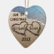A forma cardíaca em acrílico está em estoque! Adicione facilmente seus próprios nomes personalizados ou qualquer texto (mostrado como, por exemplo, "Nosso Natal das 1ruas", e apenas adicione o ano desejado) com nomes do casal especial ou da noiva e noivos recém-casados nos corações para personalizar este lindo ornamento popular de forma cardíaca com uma foto original de dois corações escritos na areia ao longo da água azul do oceano para significar amor e romance. Conceito de excelente para amor, viagem, recem casados e próximo verão, salve a data de casamentos na praia. Um enfeite especial, divertido, pessoal e único para dar a essa pessoa especial, namorada ou namorado, noiva e noiva ou a qualquer casal. Este design está de um lado e também está disponível com o design de ambos os lados. Veja nossa grande coleção de presentes nesta design na loja de placas de MVDs.
