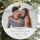 Nosso Primeiro Natal Envolvido Cerâmica Arredondada Personalizada Ornament de Fotos e Nomes — Este elegante ornamento personalizado de árvore de xmas é o presente perfeito para qualquer casal se preparar para amarrar o nó. Tanto a frente como a parte de trás da decoração são idênticas, com modelos de personalização que permitem uma foto personalizada, data de noivado ou ano em uma simples fonte de serifa, e nomes em um bonito roteiro de caligrafia manuscrito, junto com uma coloração d'água rosa e cor rosa pincelada, folhagem festiva e sotaque de arco.
