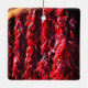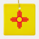 Um ornamento quadrado com uma imagem da bandeira do Estado do Novo México na frente e uma imagem de pimentões ristra vermelhos nas costas.