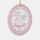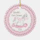 O Primeiro Ornamento de Natal do Bebê apresenta um doce cavalo de balanço cor-de-rosa, emoldurado em rendas cor-de-rosa com caimento marrom! Personalize com sua informação e data do bebê e você está pronto para ir! Um maravilhoso presente de guardiã para o natal de 1rua do seu bebê.