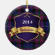 Ornamento cerâmico da xadrez colorida, com o orgulho azul, roxo, verde, e branco tradicional da regência do teste padrão da xadrez de tartan de Scotland, como um fundo. Os gráficos de um protetor roxo e goldtone gostam da chapa, têm o texto roxo e branco feito sob encomenda pronto para personalizar. Grande ornamento de vista. Faz um grande presente ornament e a decoração para outros usos em torno da casa.