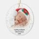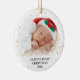 Este Enfeites de natal bonito é decorado com estrelas douradas sobre fundo branco. Facilmente personalizável com o nome do bebê, ano e foto. Por favor, note que as estrelas brancas não aparecerão na sua foto.