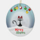 Adorável ornamento cerâmico com ilustração de borbulhas vermelhas, amarelas e verdes e um gato preto com chapéu de Santa.