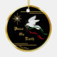 Personalize e decore a sua árvore de Natal com este lindo Enfeites de natal de "Um tipo" de pomba branca! Uma Porta Branca Serena Voa Entre as Estrelas e um Ramo de Oliva com Fitas Vermelhas e Verdes Fluindo com uma Borda Dourada... Espalhando "Paz Na Terra"! Esta é uma Design de Arte Original do Artista Kerry Miller."