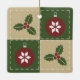 Quatro quadrados em verde e bronzeado são enfeitados com ornamentos vermelhos decorados com flocos de neve brancos e holly verde com bagas vermelhas. A costura branca acrescenta um toque decorativo, dando ao padrão repetitivo a aparência de uma colcha, criando um sentimento perfeitamente aconchegante para o feriado de Natal.