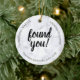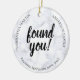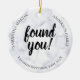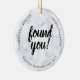 Reunião de adoção para comemorar uma reunião, reunião ou contato. Para adotivos que localizaram, contataram ou reuniram membros biológicos da família biológica que desejam uma lembrança, manutenção ou presente de token para compartilhar com a família recém-encontrada, este ornamento declara que você foi encontrado em letras grandes pretas com modelos que permitem registrar a data da reunião ou contato e nomes ou outras mensagens. Preparado em mármore branco. O outro lado do ornamento permite que você carregue uma foto. Guardar a mãe biológica, o pai, os meia-irmãos ou outro membro da família alargado.