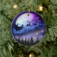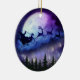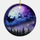 Este adorável ornamento cerâmico apresenta uma ilustração da silhueta de Papai Noel em uma magia rena-manga, voando na noite iluminada sobre a floresta de Natal, enorme lua roxa com crateras, nuvens e estrelas azuis e roxas.