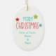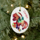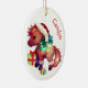 Na frente deste ornamento cerâmico de manutenção para uma criança é um pônei adorável vestindo um chapéu de Papai Noel e botas. Ele tem uma coroa de férias com luzes no pescoço. Ele fica entre um bolbo de árvore de Natal e um pacote de presente verde e vermelho, envolto de forma brilhante. O verso do ornamento tem uma mensagem de Feliz Natal, o nome do seu filho e a sua assinatura. Perfeito para uma filha, filho, neta ou neto, especialmente uma que ama cavalos!