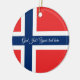 Bandeira norueguesa personalizada deus Jul! Ornamento da árvore de Natal. Decoração personalizada de Natal em X-mas em forma redonda ou cardíaca. País Patriótico Bandeira da design da Noruega. O tema escandinavo do xmas decor para amigos, família, filhos, colega de trabalho, funcionário, chefe, filhos, casal de casamento, recém-casados, mãe e pai, avós, parentes, bebê etc. Adicione a saudação e foto da sua estação no verso, opcionalmente. Modelo de tipografia de script elegante. Dourada cadeia de suavização incluída. Crie a sua própria Escandinávia para um Natal de 1rua juntos ou outra ocasião.