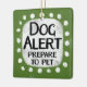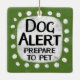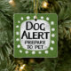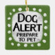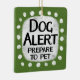 Um design de animais tipográficos, irreverente e fofo, que diz "Alerta de Cachorro, Prepare-se para Pet". Ele apresenta texto preto e vermelho em um retângulo branco com pontos brancos engraçados e brincalhões ao redor dele, tudo em um fundo de cinza.
