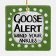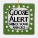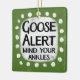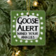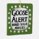 Um design de animais tipográficos irreverentemente estranho que diz "Alerta de Ganso, Mente Seus Ankles". Ele apresenta texto preto e vermelho em um retângulo branco com pontos brancos engraçados e brincalhões ao redor dele, tudo em um fundo de cinza.