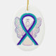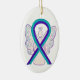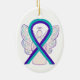 O ornamento personalizado apresenta a pintura de uma arte de anjo de fita de reconhecimento teal e roxa. A fita de reconhecimento roxa e teal tem o significado de apoiar a conscientização sobre a prevenção do suicídio. (A prevenção suicida também utiliza a fita amarela de sensibilização.) O roxo e o chalé também combinam as duas cores de conscientização para violência doméstica (roxa) com agressão sexual (chalé) para mostrar apoio a ambas as causas. A arte da fita de reconhecimento roxa e teal pode ser personalizada com mensagens personalizadas para fazer ornamentos de causas de excelentes ou pendentes para arrecadadores de fundos, presentes de Natal ou feriados, ou outros eventos ou ocasiões especiais.