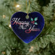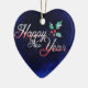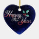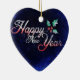 Um adorável ornamento cerâmico em forma de coração, mostra a mensagem, "Feliz ano novo", sobre fundo azul, com holly. Design está em ambos os lados deste ornamento de Ano Novo. Use-se ou dê como presente para o Ano Novo!
