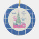 Um adorável ornamento de Natal, que apresenta uma ilustração retro-química de dois filhotes de ursos polares que decoram uma árvore para os Feriados na frente e um padrão de grelha azul e creme no verso. Personalize-o com o nome da criança e o ano. Você também pode adicionar uma foto de bebê no verso usando a ferramenta do editor. © ArianeC Ilustrações — Todos os direitos reservados