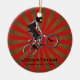 Ornamento Personalizado do Extreme Biker Natal 20XX. Um motociclista fazendo uma caminhada contra um fundo vermelho e dourado de explosão de estrelas. Todo texto personalizável, frente e verso!