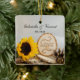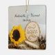 Comemore seu dia de casamento com o encantador Ornamento Redondo de Casamentos Russos de Madeiras de Girassol. Personalize-o com os nomes pessoais da noiva, noiva e data da cerimônia de casamento. Sinta-se livre para alterar o texto ou a fonte de acordo com as suas necessidades nupciais. Um bonito bosque ou ornamento de casamento florestal faz um único gesto para salvar o anúncio da data, guardar o recheio, guardar presente de chá de panela personalizado, presente de noivado ou guardar presente de casamento. Este ornamento personalizado de casamento de chiques apresenta uma fotografia da natureza, ligeiramente melhorada digitalmente, de uma flor de girassol amarela, fatias de madeira com a palavra AMOR nela, cone de pinheiro castanho e véu de brasa branco com uma burvolta e fundo de cebola branca. Perfeito para um tema casual, mas clássico, de casamento natural ao ar livre.