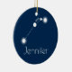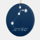 Ornamento de constelação Zodiac de Aries Personalizados. Apresentando a constelação de Aries em um fundo de Marinho, este ornamento de seriados personalizados faz uma adição perfeita à sua árvore de Natal. Aries é o primeiro sinal do Zodíaco e inclui todos os Nasceres de 21 de março - 19 de abril. O símbolo de Aries é o Ram. Os traços de personalidade de Aries são aventureiros, negros, confiantes, otimistas e impacientes. Aries's Birthstone é o Planeta de Diamante e Aries's Ruling é Marte. Cor e Texto em Segundo Plano podem ser personalizados