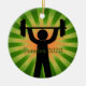 Malhação de Treinamento de Peso Ornamento Cerâmico em um fundo de starburst verde e laranja com texto personalizável.