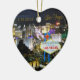 O ornamento da árvore de Natal de Las Vegas foi mostrado aqui com uma data de ocasião personalizada. Áreas de texto são modelos que podem ser excluídos ou alterados clicando primeiro na caixa azul "editar design" à direita do item. Design apresenta uma fotografia aérea noturna da famosa "Strip" com marcos icônicos, assim como o famoso neon bem-vindo ao fabuloso sinal de Las Vegas. No verso há um coração vermelho com modelos de texto personalizados.