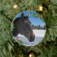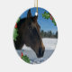 Ornamento de foto de cavalo de Natal. Use como está com este cavalo marrom em uma pastagem cheia de neve, ou personalize usando as modelos de ambos os lados para adicionar a foto do seu animal de estimação. Holly e bagas decoram a borda deste ornamento de xmas plano, de lado duplo para pendurar.