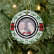 O primeiro ornamento personalizado da cor damasco verde de Natal do casal. Há um círculo preto e branco para sua foto e uma faixa preta e vermelha.