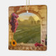 Um ornamento totalmente personalizável com um tema vinícola: uma paisagem de vintagem romântica em italiano, enquadrada por um arco romano, uvas, vinho e girassol. Você pode substituir a paisagem por sua própria foto favorita. Se não quiser usar isto como ornamento de casamento ou para o seu primeiro Natal juntos, pode remover os anéis de casamento.