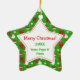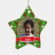 A frente deste Enfeites de natal em forma de estrela fofo tem sua fotografia enquadrada em um fundo verde, vermelho e branco festivo de imagens de Papais noeis, flocos de neve, arcos e ornamentos. O nome do seu filho é colocado em uma placa vermelha brilhante. O outro lado do ornamento mantém seu texto personalizado em vermelho e verde em uma estrela branca colocada sobre o mesmo fundo colorido. É fácil substituir a foto de amostra pela sua; use personalizar para mover sua foto para a melhor posição.