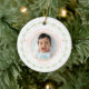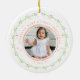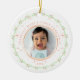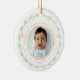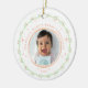 Celebre o primeiro Natal do seu bebê ou dê como presente a novos pais com este adorável Enfeites de natal de cerâmica. Frente e verso apresentam um lugar para adicionar diferentes fotos que estão cercadas por uma borda circular de pêssego-cobre, uma delicada coroa verde-rosa e uma coroa de estrelas rosa. Personalize ainda mais com o nome do bebê e o "primeiro Natal" no topo e no ano abaixo da foto. Clique no botão Personalizar para personalizar seu texto e fotos nos modelos fornecidos. Um presente de manutenção que fornecerá memórias familiares para toda a vida.