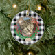 Um Enfeites de natal de gato personalizado com um padrão clássico de xadrez de Buffalo preto e branco e uma coroa de morango vermelho. Ambos os lados podem ser personalizados. Na frente, adicione sua fotografia de gato e seu nome. No verso adicione sua própria mensagem de Feriado. © ArianeC Ilustrações — Todos os direitos reservados