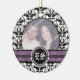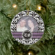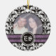 Ornamento de fotos de casamento tema damasco preto e branco com sua foto de precioso enquadrada em bandas preto e branco, preto e roxo, e suas iniciais em um círculo.