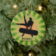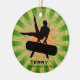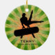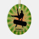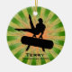 Ginástica Personalizada Ornament Natal 20XX. Um ginasta se coloca sobre o cavalo pommel contra um fundo de estrelas verde e laranja. Todo texto personalizável, frente e verso!