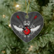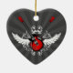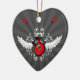 ornamento cerâmico personalizável em forma de coração, com guitarras elétricas de rocha cruzadas, asas e flores de vintage em vermelho, branco e preto. Você pode personalizá-lo com texto personalizado ou alterar a forma do ornamento e a cor do plano de fundo.