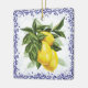 Este ornamento bonito apresenta limões lenhosos cercados por uma borda real de filigrana azul! Excelente de ter em casa a qualquer hora do ano! Esta adorável design, ao estilo europeu, apresenta limões lenhosos cercados por uma fronteira de toile! Um monte de limões brilhantes e maduros num galho rodeado de folhas verdes generosas. Uma borda de filigrana azul-marinho real borda o design. Um toque perfeito para sua cozinha italiana ou francesa inspirada no campo! Personalize as costas também! Este é um belo presente a favor de qualquer festa em qualquer momento do ano!