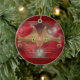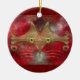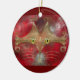 Uma face estilizada de gato feita de curvas e curvas douradas brilhantes, com olhos largos de ouro verde, contra um fundo fractal vermelho.