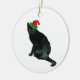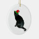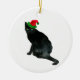 Um gato preto veste um boné de Papais noeis vermelhos e verdes nesta adorável ornamentação de férias.