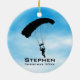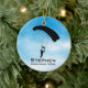Paraquedismo do Céu Ornamento Personalizado Natal 20XX. Os Skymergs formam um círculo de queda livre contra um céu azul com nuvens de fundo. Todo texto personalizável, frente e verso!