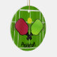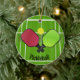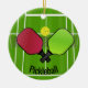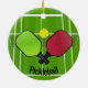Ornamento de Design de Pickleball com texto personalizável em ambos os lados. O Pickleball é um esporte de raquete/remo que foi criado através da combinação de elementos de vários outros esportes de raquete. Dois ou quatro jogadores usam pás sólidas para acertar uma bola perfurada de polímero (como uma bola de wiffle) sobre uma rede.