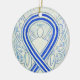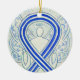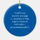 O ornamento do anjo da guarda apresenta a pintura de um anjo de fita de reconhecimento azul e branco. Fita de sensibilização azul e branca significa suporte para esclerose lateral amiotrófica (ELA). A arte da fita de anjo de consciência azul e branca pode ser personalizada com mensagens personalizadas para fazer ornamentos de causas de excelentes ou pendentes para arrecadadores de fundos, presentes de Natal ou feriados, ou outros eventos ou ocasiões especiais.