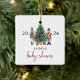 Ornamento de Chá de fraldas de Noz-Cacker. Este adorável e único ornamento de chá de fraldas de quebra-cabeça de feriado apresenta soldados pintados manualmente de brinquedo de preguiçoso de cor d'água em torno de uma bela árvore e texto para adicionar seu nome de família e ano. A parte de trás tem um padrão correspondente. Localize itens correspondentes na Coleção de Nozes Feriados de Natal.
