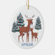 Um veado adulto e bebê é apresentado neste ornamento cerâmico, juntamente com três árvores decoradas de Natal. O texto pode ser personalizado.