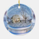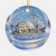 Dentro da neve um globo é uma paisagem do inverno com uma casa de campo overshadowed por árvores desencapadas do bordo e de cereja. A neve brilha no gramado, arbustos do azevinho cobertos com o flanco vermelho brilhante das bagas a porta, e os flocos de neve caem através do ar congelado. Ao lado do globo um chickadee pequeno olha curiosa dentro na cena diminuta.