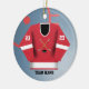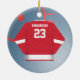 Personalize este ornamento do jérsei do jogador de hóquei com seus número e nome da equipe na parte dianteira e na sua parte traseira do nome e do número sobre. Faz um grande presente para seu jogador de hóquei favorito ou igualmente faz um grande presente da equipe. Excelente para o segundo grau e presentes internos da liga de hóquei!