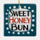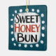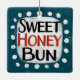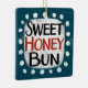 Uma design de comida tipográfica bonita que diz "Docinho de Mel". É texto preto e vermelho em um retângulo branco com pontos brancos engraçados e brincalhões ao seu redor, todos sobre um fundo lacrimogêneo.