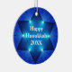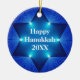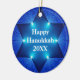 Um ornamento brilhante, original, e bonito de Hanukkah com a estrela de David e as luzes iluminadas em um fundo azul com "texto de Hanukkah 20XX feliz" em um lado nas letras brancas. Adicione facilmente o ano ou o texto ou suprima d se não necessário. A sala no de volta a personaliza se desejada. A lembrança perfeita da lembrança de Hanukkah por 2012 ou qualquer anos!