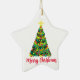 Adorem a vossa árvore de Natal com este ornamento festivo que apresenta uma árvore de Natal colorida com a saudação "Feliz Natal" em letras vermelhas contra um fundo branco de um lado, e vermelho brilhante sem design do lado do sacudir. Várias formas e tamanhos estão disponíveis. Trabalho de arte por Roupa e Cobrança do ButterCup.
