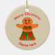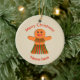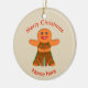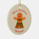 Este ornamento apresenta um desenho fofo de uma mulher colorida de pão de gengibre. Ela tem olhos negros com pupilas brancas e bonito pestanas pretas e um sorriso grande em seu rosto. Ela também tem bruxas vermelhas e verdes na saia e no topo, pronta para uma festa de Natal.